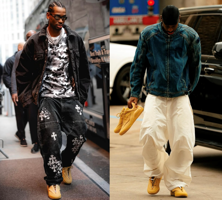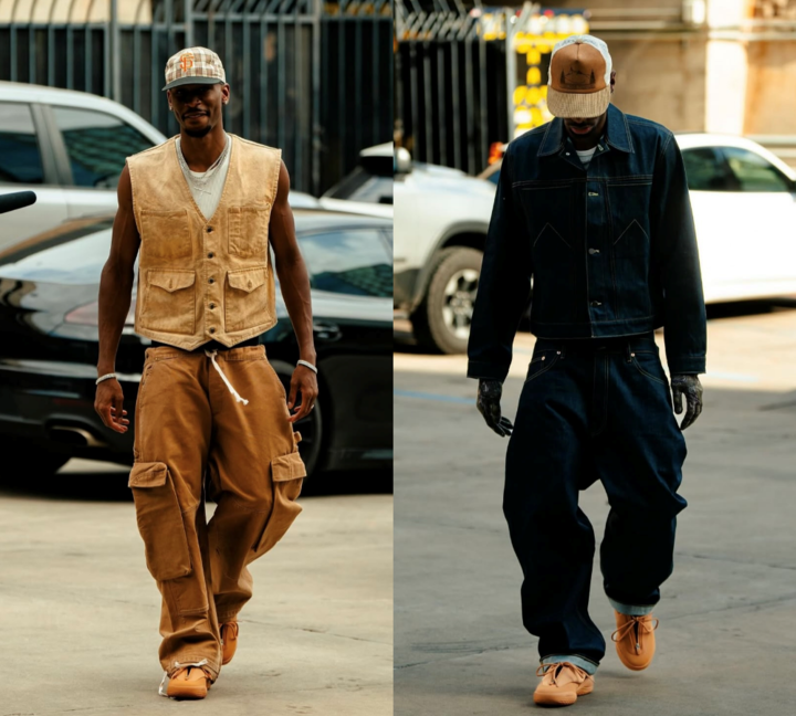 다른 사진 속에선 데님 레이싱 스타일 재킷을 착용하여, 빈티지한 느낌과 스포티한 분위기를 동시에 전달하며, 재킷의 강렬한 디테일과 컬러가 룩에 강조된 포인트를 제공하는 것이 인상적이다. 하의로 매치한 아이보리 컬러의 와이드 팬츠는 상의의 데님 재킷과 잘 어우러져 룩에 밸런스를 맞춘다. 포인트로 더해진 밝은 브라운 컬러의 시그니처 농구화와 검은 듀렉은 룩의 힙한 포인트가 되어 스트릿 무드를 완성해 내는 역할을 한다.
