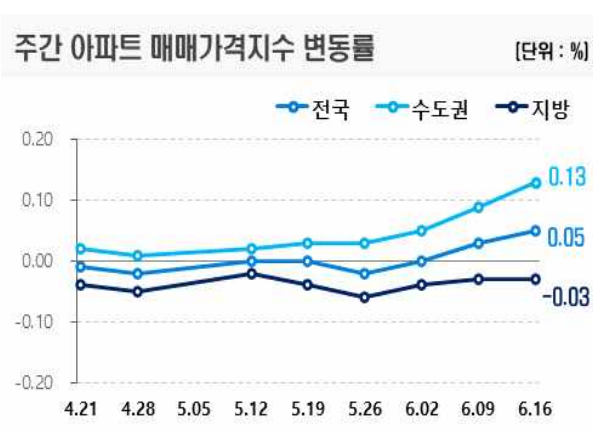 지난 19일 한국부동산원 부동산통계처는 주간 아파트가격동향조사(지난 16일 기준)를 통해 전국 아파트 매매가격이 0.05%, 전세가격이 0.01% 상승했다고 밝혔다.