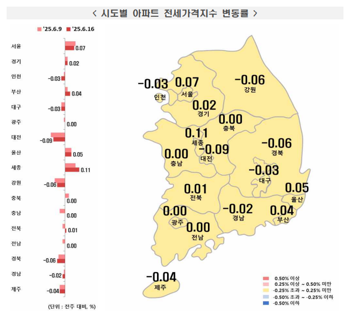 전세가격은 전국적으로 0.01% 올랐다. 수도권은 0.03%로 상승폭을 유지했으나 서울은 0.07%로 전주(0.08%)보다 소폭 둔화됐다. 울산(0.05%), 부산(0.04%)은 상승했지만 대전(–0.09%), 경북(–0.06%) 등은 하락했다.