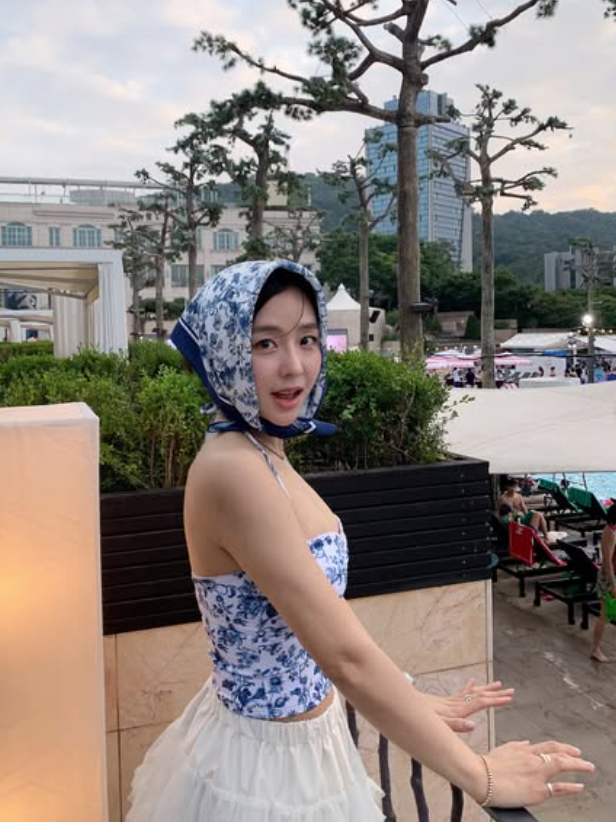 예원은 파란색과 하얀색 조합의 스카프, 크롭 상의를 입고 하얀색 스커트로 멋을 냈다.