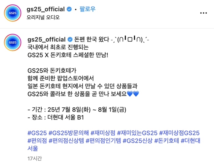 한편, 앞서 지난 5월 GS25는 자체 브랜드 '유어스' 상품을 일본 돈키호테 매장 약 400곳에 입점시킨 바 있으며, 이번 팝업스토어는 양측의 두 번째 협업이다.