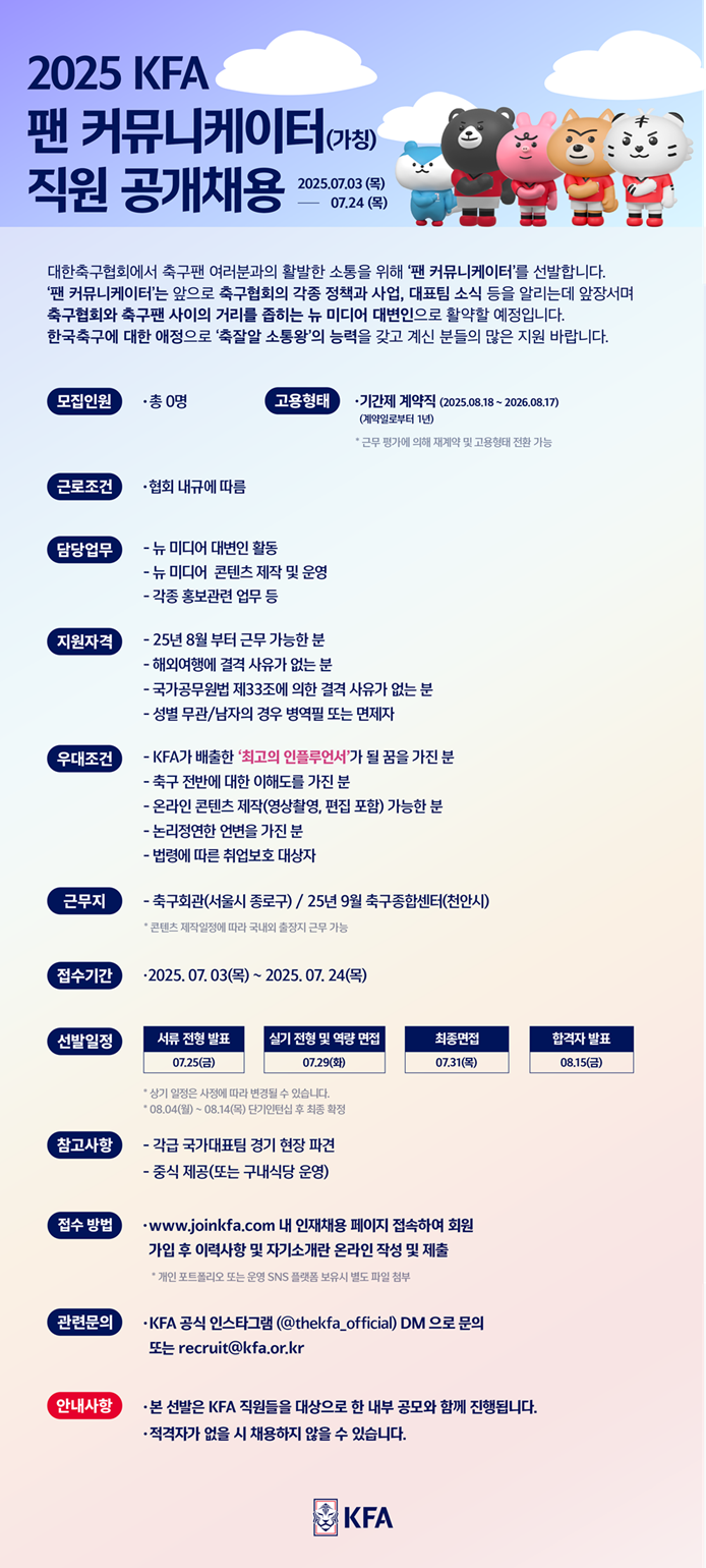 ‘축잘알 소통왕’과 ‘KFA가 배출한 최고의 인플루언서가 될 꿈을 가진 사람’을 공모 키워드로 내세운 이번 선발의 서류 전형은 오는 3일부터 24일까지이며, 학력과 성별은 무관하다. 최고의 적임자를 찾기 위해 이번 선발은 대한축구협회에 현재 재직중인 직원들을 대상으로 한 사내 공모와 동시에 진행된다. 채용 관련 상세는 대한축구협회 공식 홈페이지의 공지사항과 협회 공식 SNS에서 확인할 수 있다.