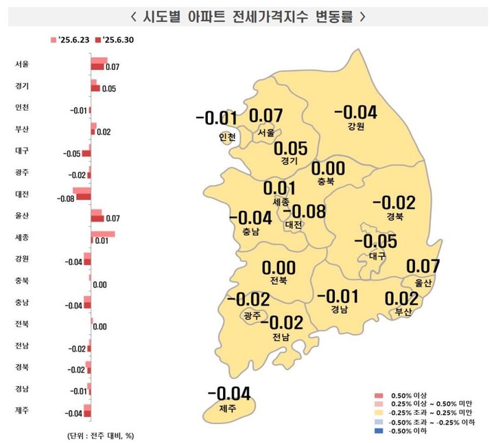 地方でも下落傾向が持続しており、5大広域市と8つの道ではそれぞれ0.04%、0.01%の下落を記録した。セジョン市は大統領選挙前後に急騰した住宅価格の上昇基調が鈍化し、わずか0.02%の上昇にとどまった。