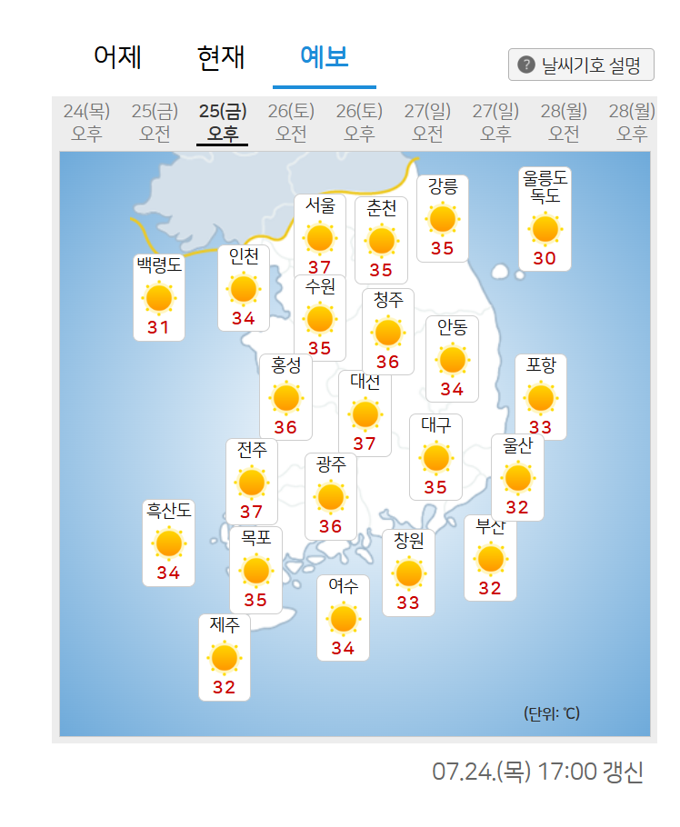 (MHN 이주환 기자) 금요일인 내일(25일)은 전국 대부분 지역에 폭염특보가 발효된 가운데, 서울과 전주, 대전의 낮 기온이 37도까지 오르는 등 극심한 더위가 기승을 부릴 전망이다. 열대야와 고온다습한 기후가 이어지는 가운데, 해상에는 높은 너울성 파도와 강풍이 예고돼 안전사고에 각별한 주의가 요구된다.