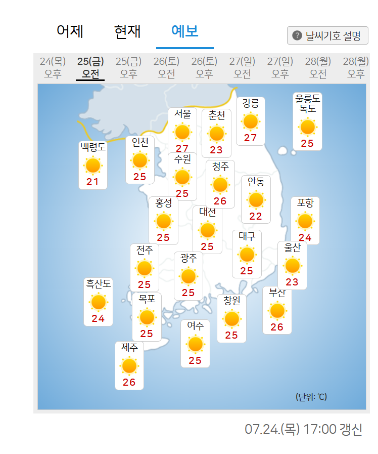 24일 기상청에 따르면 내일(25일)은 북태평양고기압의 영향으로 전국이 맑고 더운 날씨를 보이겠다. 아침 최저기온은 서울 27도, 인천 25도, 대전·광주·부산·여수·제주 25도, 대구 25도, 춘천 23도 등으로, 대부분 지역에서 열대야가 나타날 가능성이 크다.