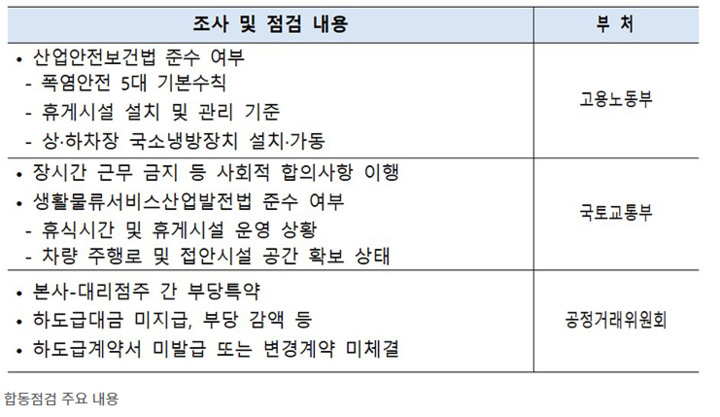 公平交易委员会将在本社与主要代理加盟店间,检查合同关系,重点排查快递公司是否存在过度分派目标、单方面解约、产业事故相关费用转嫁等不公正特约和不公平的分包交易行为。