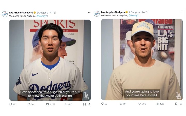 Kim Hye-sung and Tommy Hyun-soo Edman of the Los Angeles Dodgers have warmly welcomed Son Heung-min, who recently signed with Los Angeles FC, with a special video message.