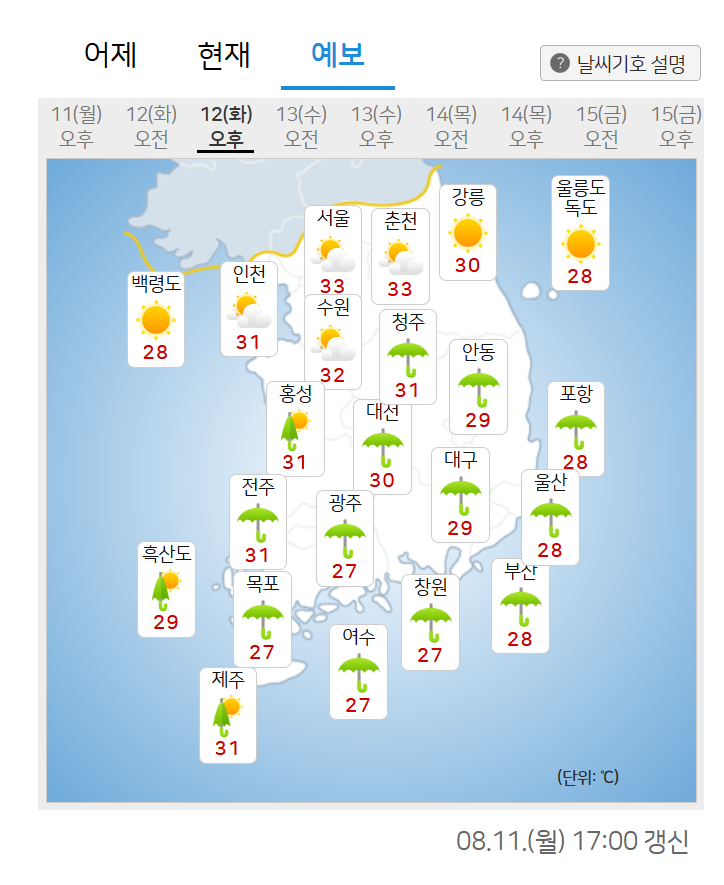 지역별 기온 자료를 보면 아침 최저기온은 서울 23℃, 인천 24℃, 대전 21℃, 대구 21℃, 부산 23℃가 예상된다.