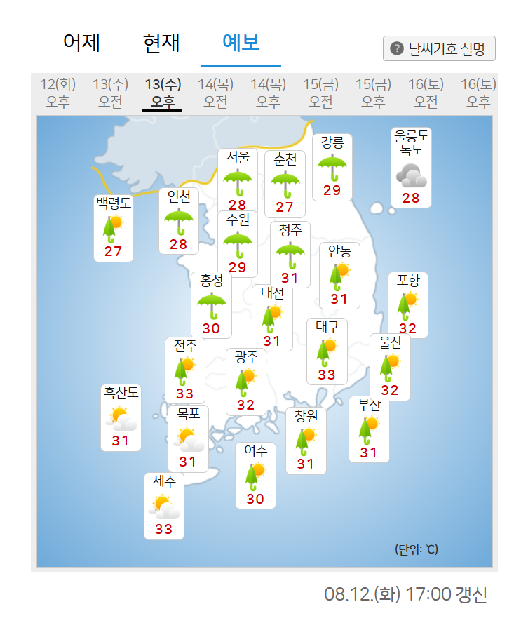 내일(13일) 전국 아침최저기온은 22~26℃로, 서울 25℃, 인천 24℃, 대전 24℃, 대구 24℃, 부산 26℃가 예상된다. 낮 최고기온은 서울 28℃, 인천 28℃, 대전 31℃, 대구 33℃, 부산 31℃로, 27~33℃를 유지할 전망이다.