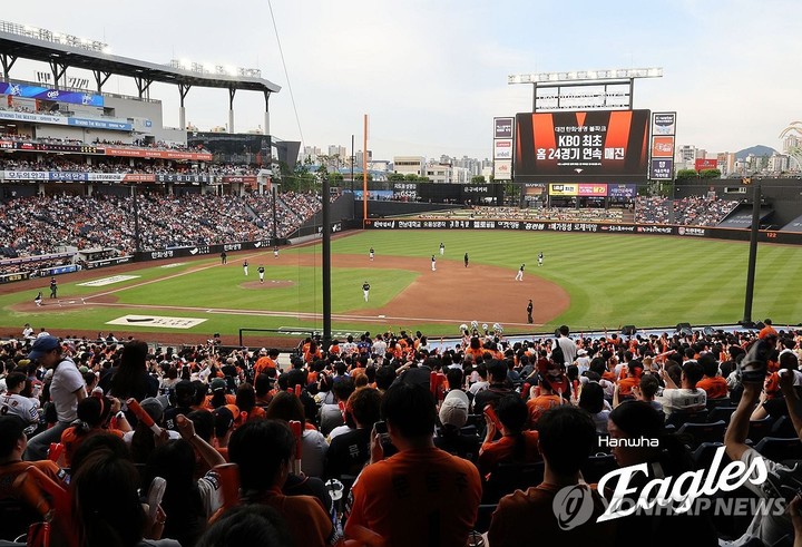 此外,本场比赛韩华鹰队在人气方面也创下新里程碑。大田韩华生命鹰士公园1.7万余座席位全部售罄,本赛季已实现48次全场爆满,打破去年创下的单赛季最多售罄纪录(47次)。