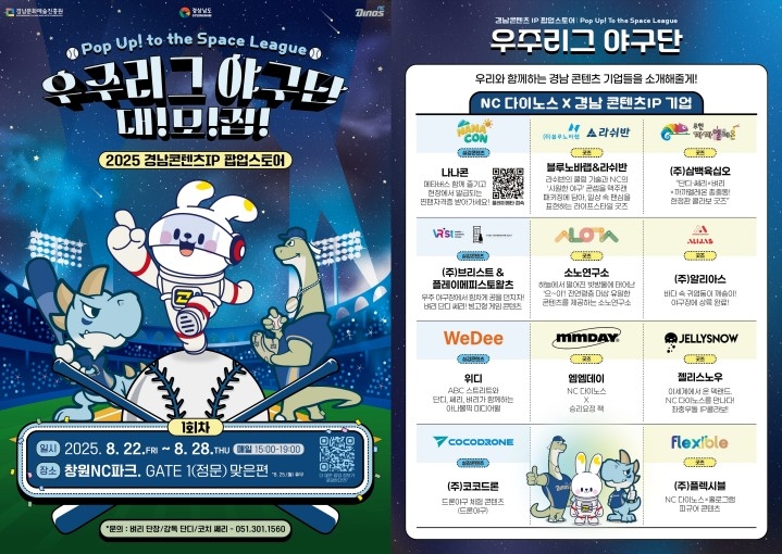 A pop-up store featuring limited edition goods starring the iconic dinosaur mascots of the NC Dinos, Dandy and Seri, has opened at Changwon NC Park’s outdoor square. The “Gyeongnam Content IP Pop-up Store,” a collaboration between Gyeongnam Province and the Gyeongnam Cultural and Arts Foundation, will operate from August 22nd.