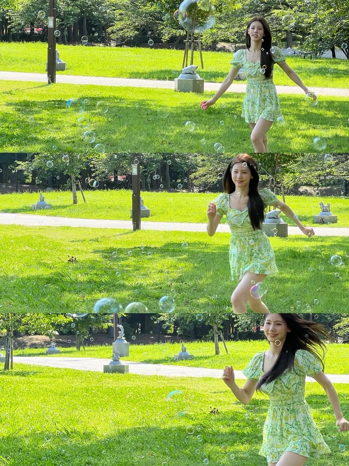 사진 속 미연은 햇살 가득한 공원에서 비눗방울을 불며 청순한 매력을 뽐냈다. 잔디 위에서 입은 화사한 그린 플로럴 원피스는 소녀 같은 분위기를 배가시켰고, 긴 생머리는 자연스럽게 흘러내리며 청초한 이미지를 완성했다.