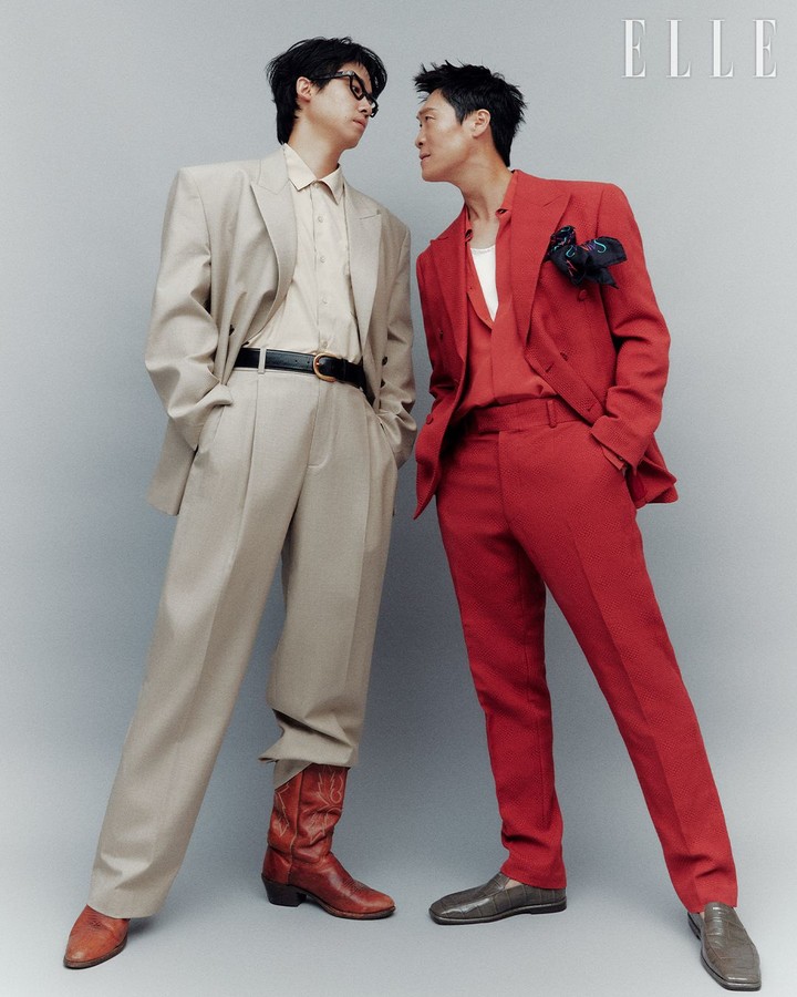 진선규와 조현철은 서로를 향해 시선을 교차시키며, 정제된 슈트 스타일과 과감한 컬러 조합으로 독특한 존재감을 강조한다. 서로 다른 색과 질감의 의상, 포즈는 생동감과 강렬한 시각적 임팩트를 더한다.