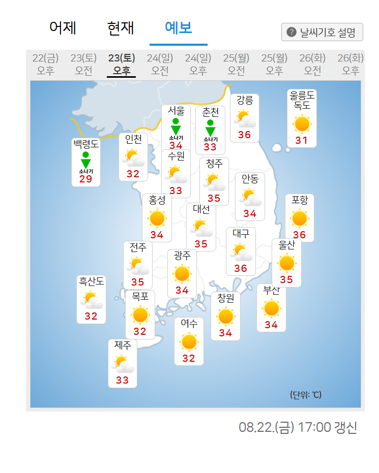 당분간 기온은 평년(최저 19~23℃, 최고 27~31℃)보다 높겠다. 내일(23일) 아침최저기온은 22~28℃, 낮최고기온은 31~36℃로 예상된다.