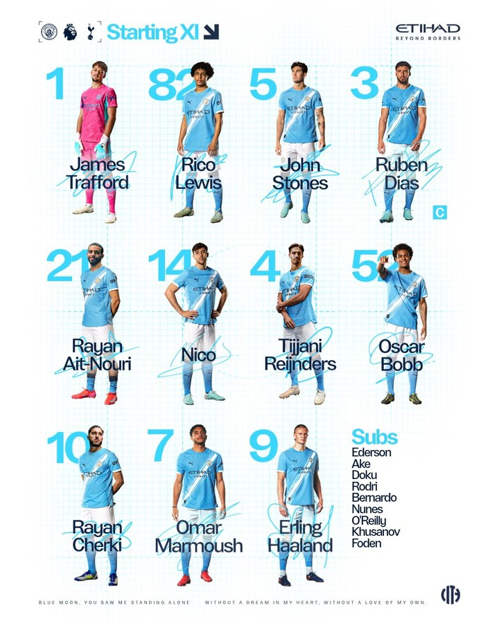 이날 홈팀 맨시티는 엘링 홀란을 필두로 오마르 마르무시, 라얀 셰르키, 오스카르 보브, 니코 곤살레스, 티자니 라인더르스, 라얀 아잇-누리, 리코 루이스, 존 스톤스, 후벵 디아스, 골키퍼 제임스 트래프드가 선발 출전했다.