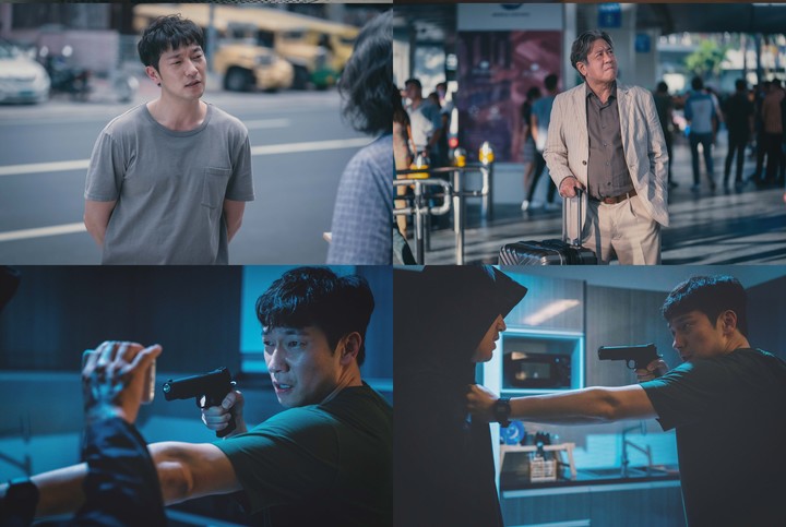 그런가 하면 오승훈 경감(손석구)의 집에 한밤 중 괴한이 침입해 권총을 겨누는 장면이 공개되며 긴장감을 높이고 있다.