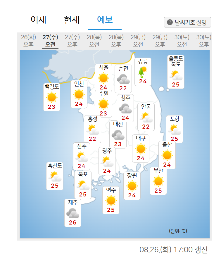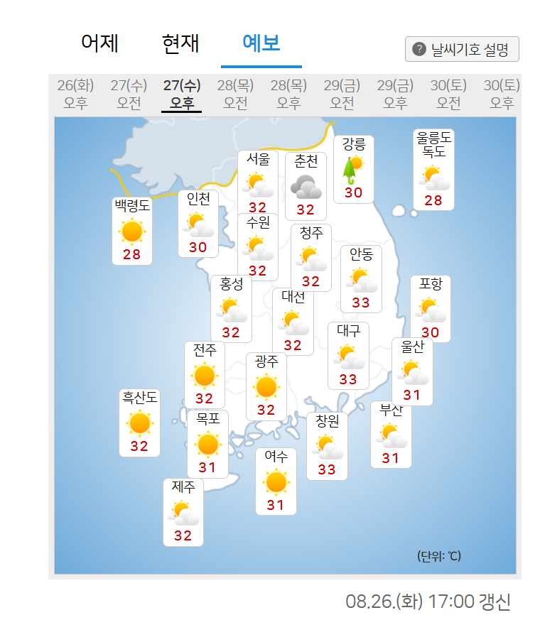 지역별 내일 아침/낮 예상 기온은 서울 24/32, 인천 24/30, 강릉 24/30, 대전 23/32, 목포 25/31, 창원 24/33, 부산 25/31, 대구 24/33, 백령도 23/28, 흑산도 25/32, 제주 26/32 수준이다.