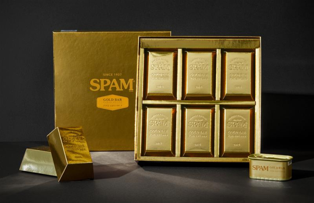 제품은 ‘골드바’ 형태의 종이 상자 6개로 구성됐고, 각 상자에는 황금색 라벨의 스팸이 담겼다. 실물 골드바와 유사한 크기·디자인으로 패키징을 완성해 선물용·컬렉션 수요를 동시에 겨냥했다.