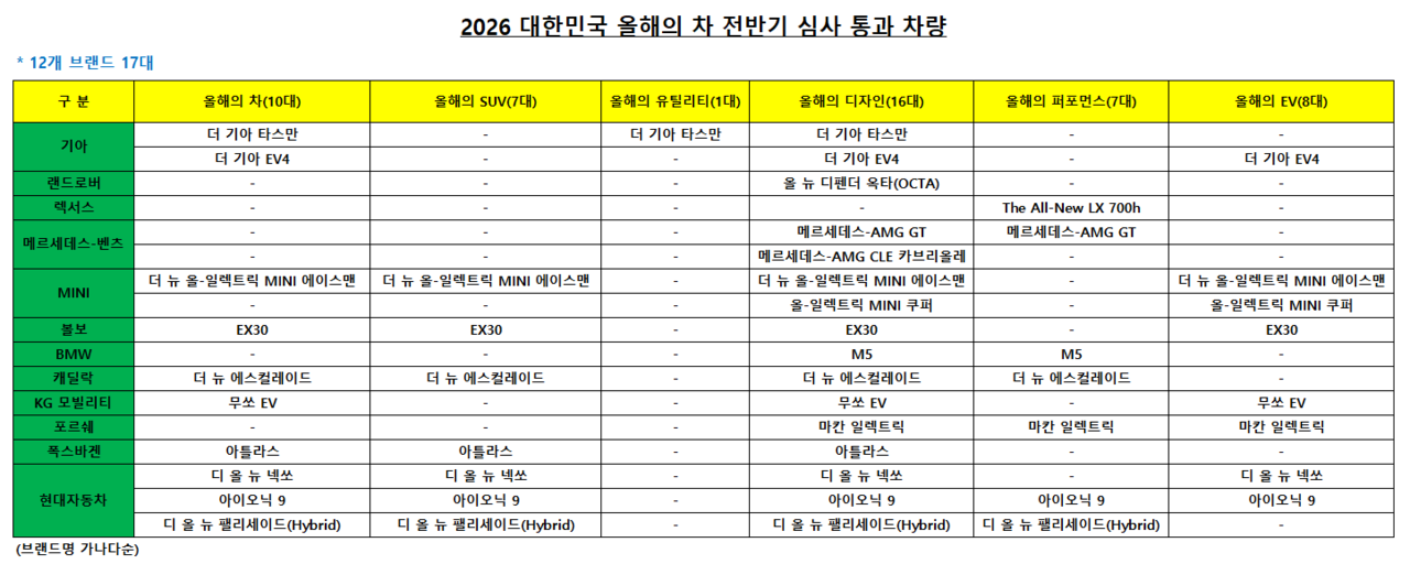 (MHN 이주환 기자) ‘2026 대한민국 올해의 차’ 전반기 심사에서 완성차·수입차 12개 브랜드 17대가 예선을 통과해 오는 내년 1분기 최종 심사 무대에 오른다.
