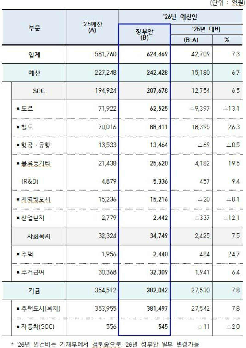 국토교통부는 29일 '2026년도 예산안'에서 내년 예산 정부안을 올해 본예산보다 4조 2000억 원 증액한 62조 4000억 원으로 확정했다고 밝혔다. 총액은 정부 예산 24조2,000억원(전년 대비 6.7%↑), 기금 38조2,000억원(7.8%↑)으로 구성됐으며, SOC·주거·사회복지·안전·미래투자 등으로 구분해 투자 효과를 극대화하도록 설계됐다.