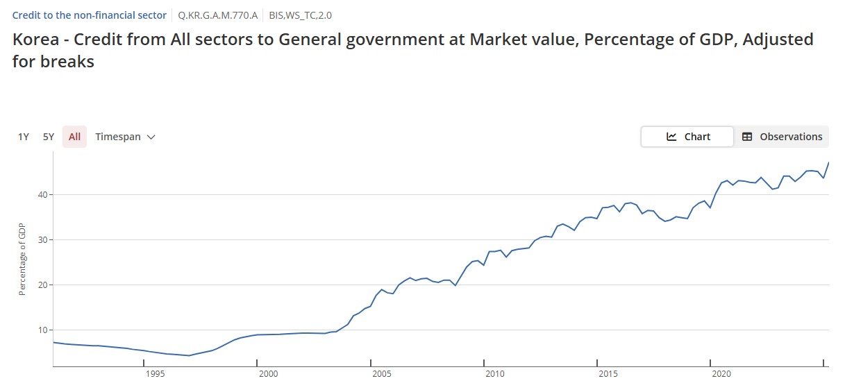 BIS 기준의 정부부채는 국제통화기금(IMF)이나 경제협력개발기구(OECD)와 달리, 비영리 공공기관과 비금융 공기업 등을 제외한 협의의 국가 채무만을 포함한다. 이 기준에 따른 GDP 대비 정부부채 비율은 코로나19 팬데믹 때인 2020년 1분기 40.3%로 처음 40%를 넘은 뒤 추세적으로 상승해왔다. 지난해 4분기 43.6%로 주춤했다가 올해 들어 크게 올랐다.