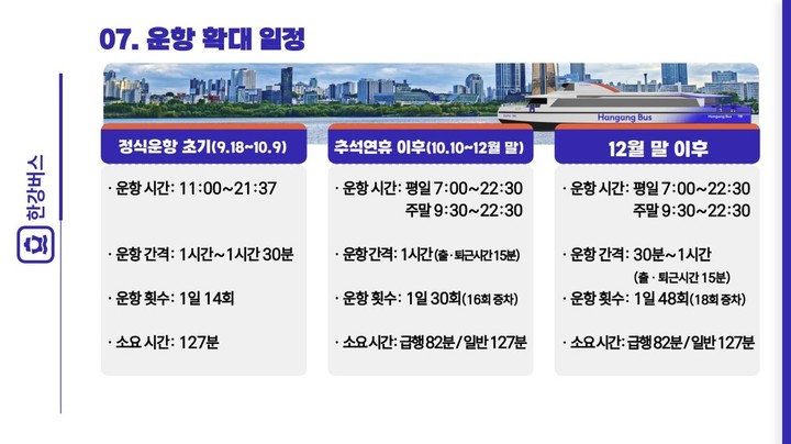 Ridership capacity and service frequency will be reinforced in stages. From October 10, weekday services will run from 7 a.m. to 10:30 p.m., and from 9:30 a.m. to 10:30 p.m. on weekends. Express services (Magok–Jamsil in 82 minutes) operating at 15-minute intervals during rush hour will be added, increasing daily round trips to 30. By year’s end, the city aims to add four more vessels, for a total fleet of 12, supporting up to 48 daily trips.