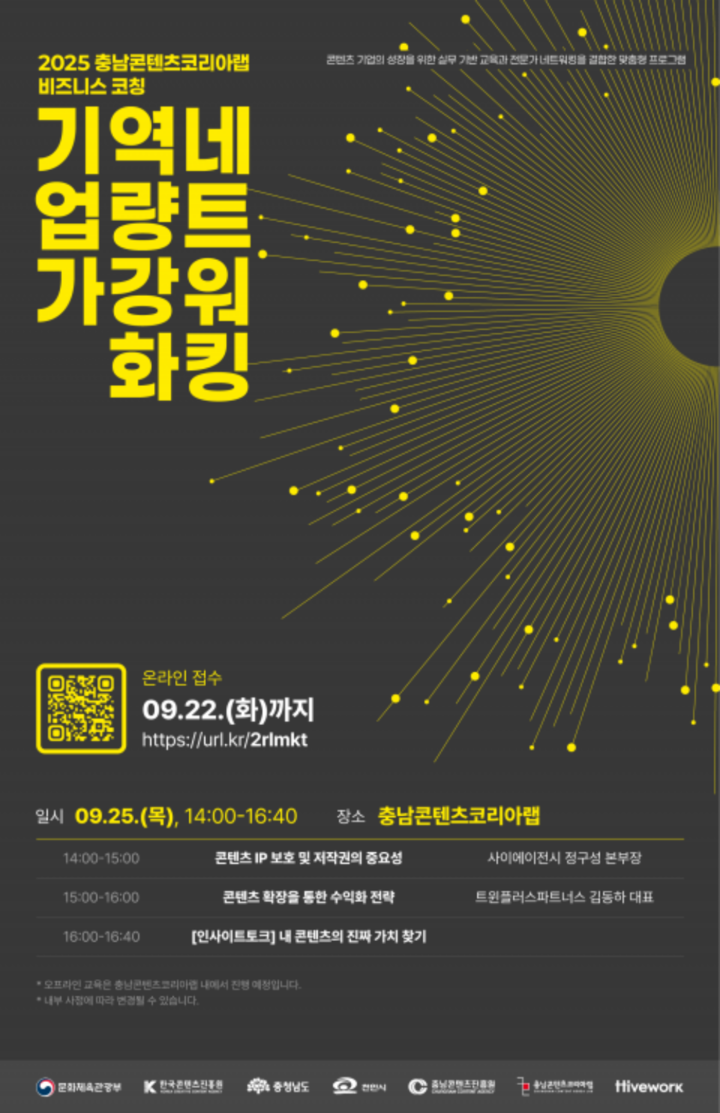 한편, ‘2025 비즈니스 코칭·기업가 역량강화 네트워킹’ 프로그램은 오는 25일, 오는 10월 23일 충남콘텐츠코리아랩에서 진행된다.