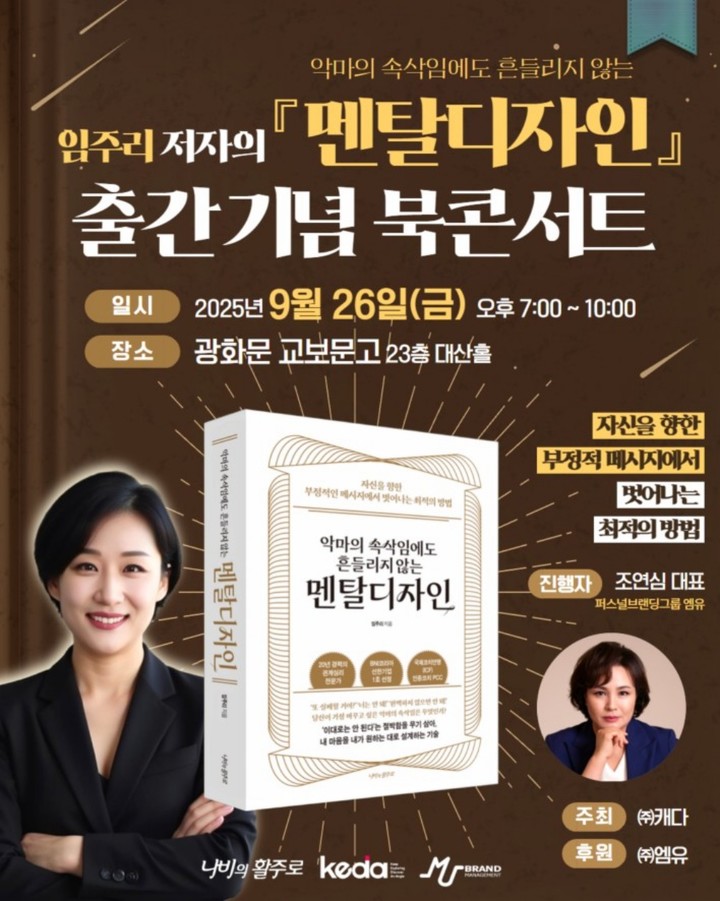 오는 26일, 임주리 대표가 첫 저서 '악마의 속삭임에도 흔들리지 않는 멘탈디자인'을 출간하고 오후 7시부터 10시까지 광화문 교보문고 23층 대상홀에서 출간기념 북콘서트를 개최한다.