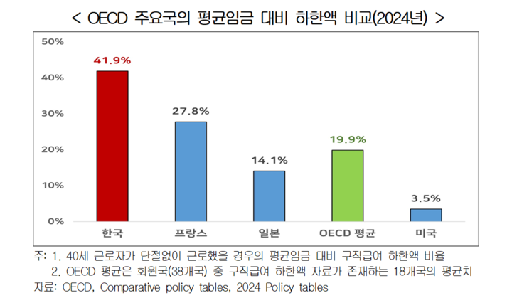 Internationally, South Korea’s minimum jobseekers allowance is equivalent to about 41.9% of the national average wage. This far exceeds the shares seen in other major economies such as France (27.8%), Japan (14.1%), and the United States (3.5%).