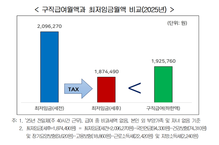 下限額が適用される離職者の求職給付は、月(30日換算)約193万ウォンで、1か月(週40時間勤務)の最低賃金210万ウォンの92%相当に達する。実際の受給額(税引き後)は約188万ウォンであり、結果として最低賃金よりも高くなる「逆転現象」が発生している。このため、働かずとも高額の給付が得られるいびつな構造となり、労働者の労働意欲の低下につながっている。