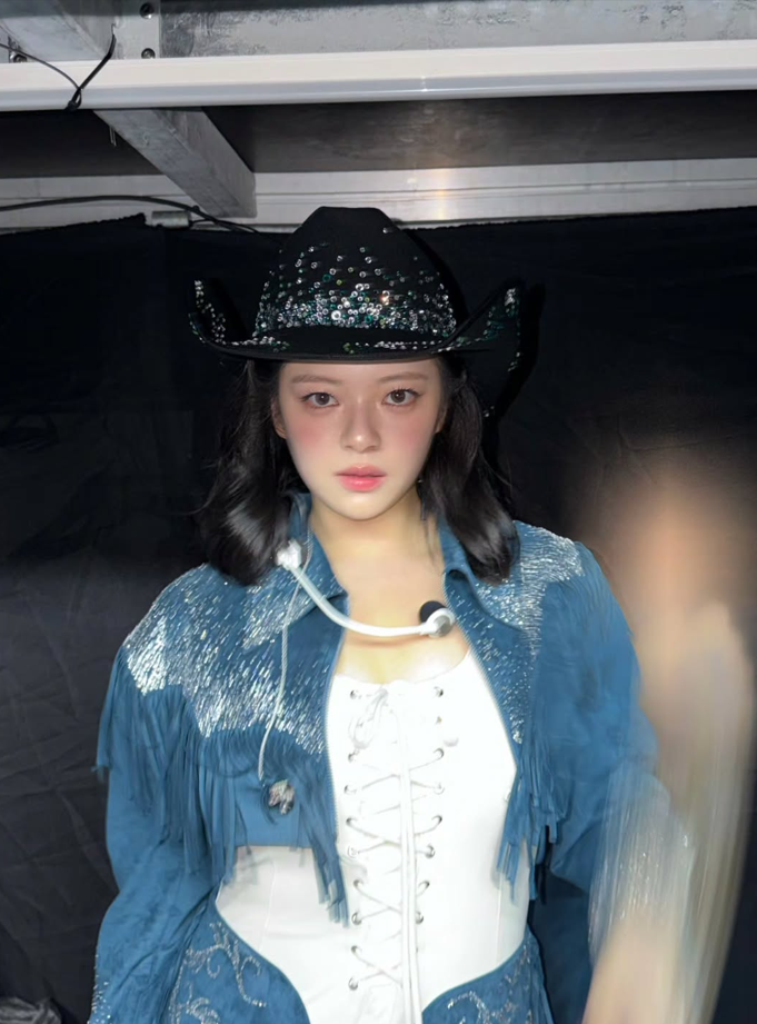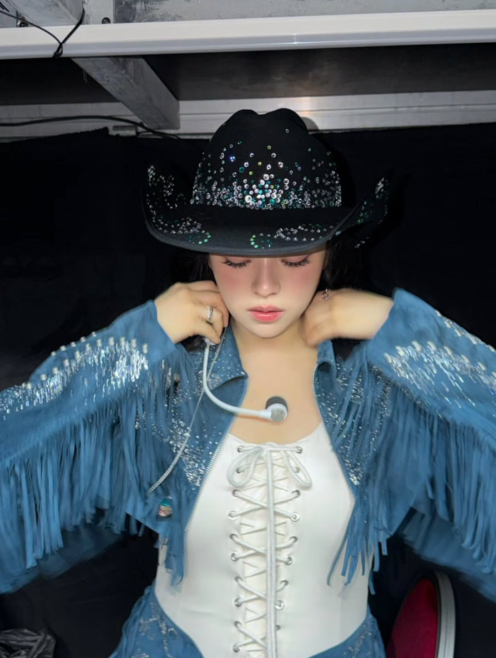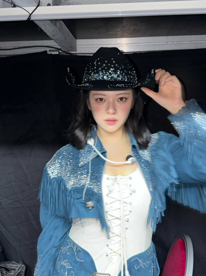 반짝이는 스톤 장식의 블랙 카우보이 햇을 더한 스타일링은 서부극 속 한 장면을 연상시키며, 정연 특유의 도회적인 분위기와 어우러져 강렬한 무드를 완성했다.