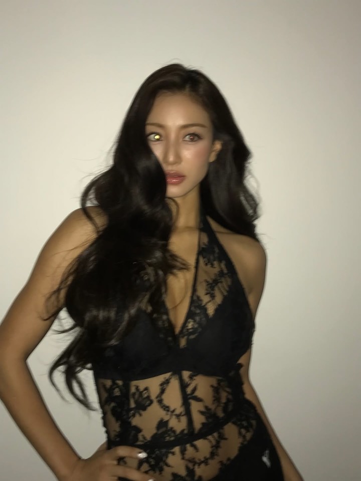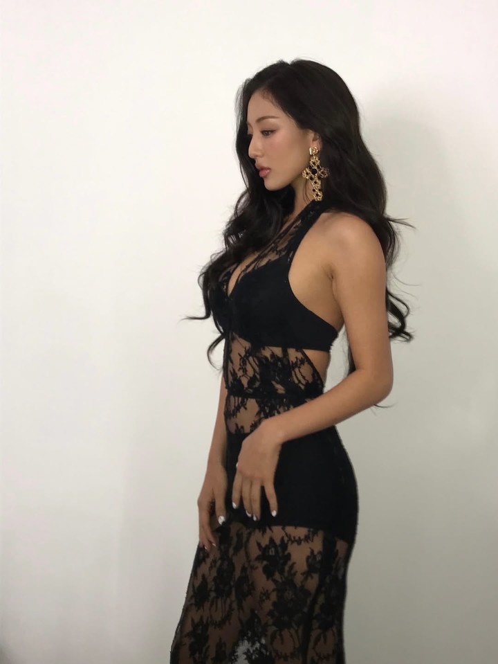공개된 사진 속 지효는 블랙 레이스 소재의 시스루 드레스를 착용하고, 과감하면서도 우아한 패션을 선보였다. 깊게 파인 브이넥 라인과 허리 라인이 드러나는 디테일이 세련된 실루엣을 강조했다.