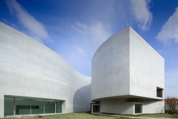 美术馆外观犹如两块巨大、灰白色的混凝土体量如同翅膀般铺展。无任何装饰的厚重大墙与下部的柱子和窗户形成鲜明对比。两大体量以波浪式柔和连接,充分展现了西扎建筑特有的诗意。