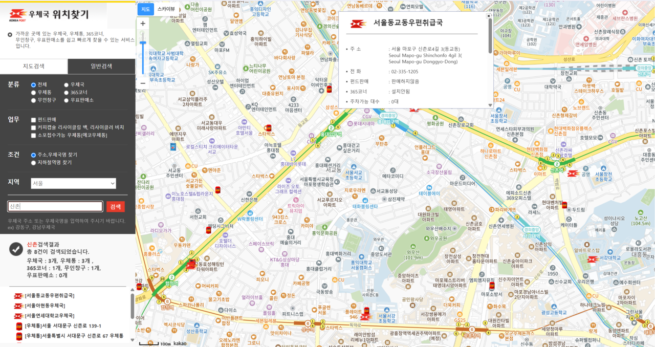 분류 항목에서 우체통을 체크하고, 지역과 상세주소를 입력하면 알아보기 좋게 리스트로 위치 정보를 제공해준다.