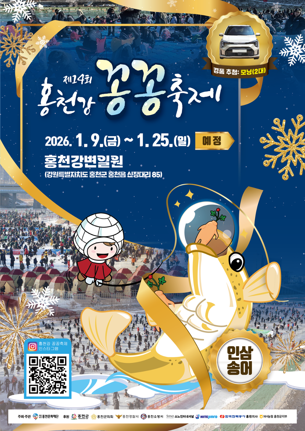 홍천강 꽁꽁축제는 오는 2026년 1월 9일부터 25일까지 홍천군 홍천읍 홍천강변일원에서 열릴 예정이다.
