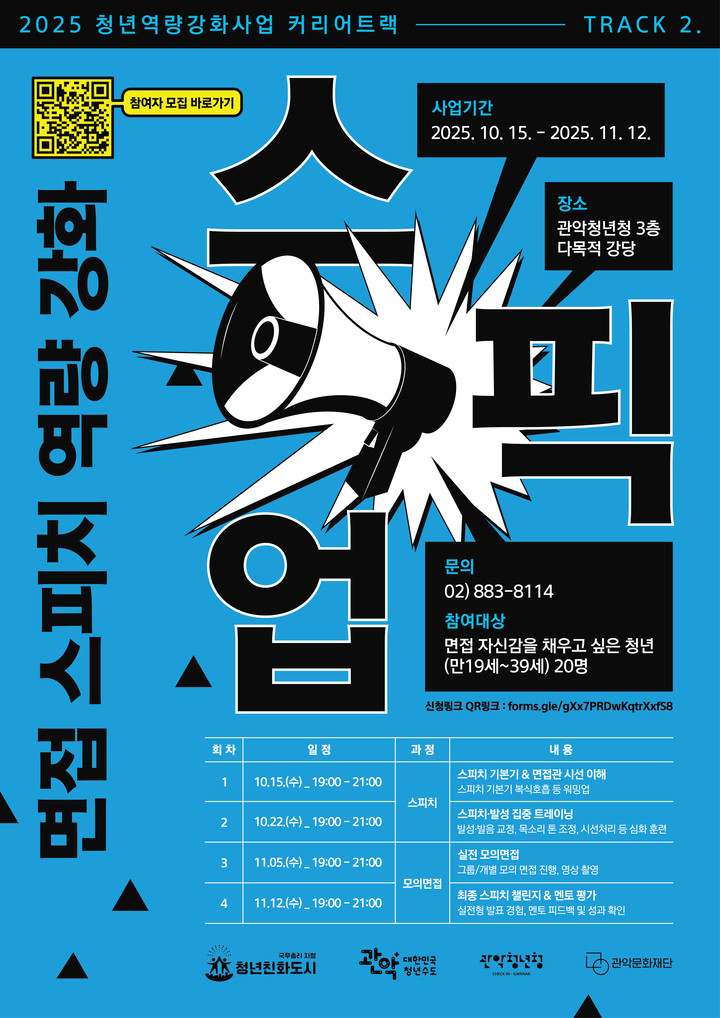 앞서 관악청년청은 지난 12일 ‘청년 역량 강화사업 커리어트랙 ’Track 2. 스픽업’ 프로그램을 성공적으로 마무리했다. 스피치와 모의면접으로 진행된 과정을 통해 100명의 청년의 면접에 대한 자신감을 높였으며, 실질적인 구직 역량을 강화할 수 있었다.