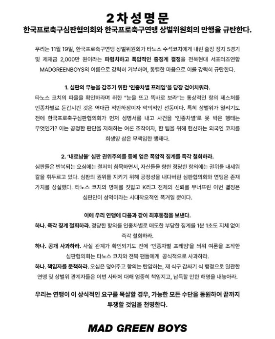전북 구단 서포터스 연합인 '매드 그린 보이즈'(Mad Green Boys)는 20일 공식 SNS를 통해 "한국프로축구심판협의회와 한국프로축구연맹 상벌위원회의 만행을 규탄한다"는 제목의 2차 성명문을 내걸었다.