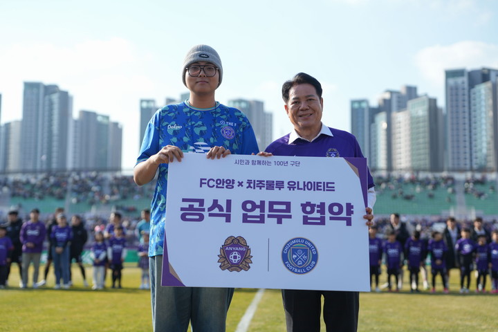협약식은 지난 22일 수원FC와 경기를 앞두고 진행됐다. 이날 협약식에는 FC안양 최대호 구단주와 치주물루 유나이티드 이동훈 구단주가 참석했다.