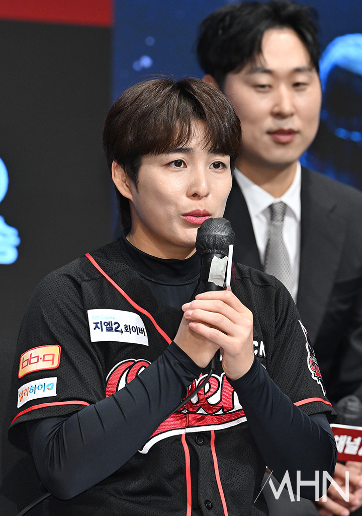 (MHN 이현지 기자) 김성연이 25일 오후 서울 구로구 더 세인트에서 진행된 채널A 새 예능 '야구여왕 제작발표회에 참석해 질문에 답하고 있다.