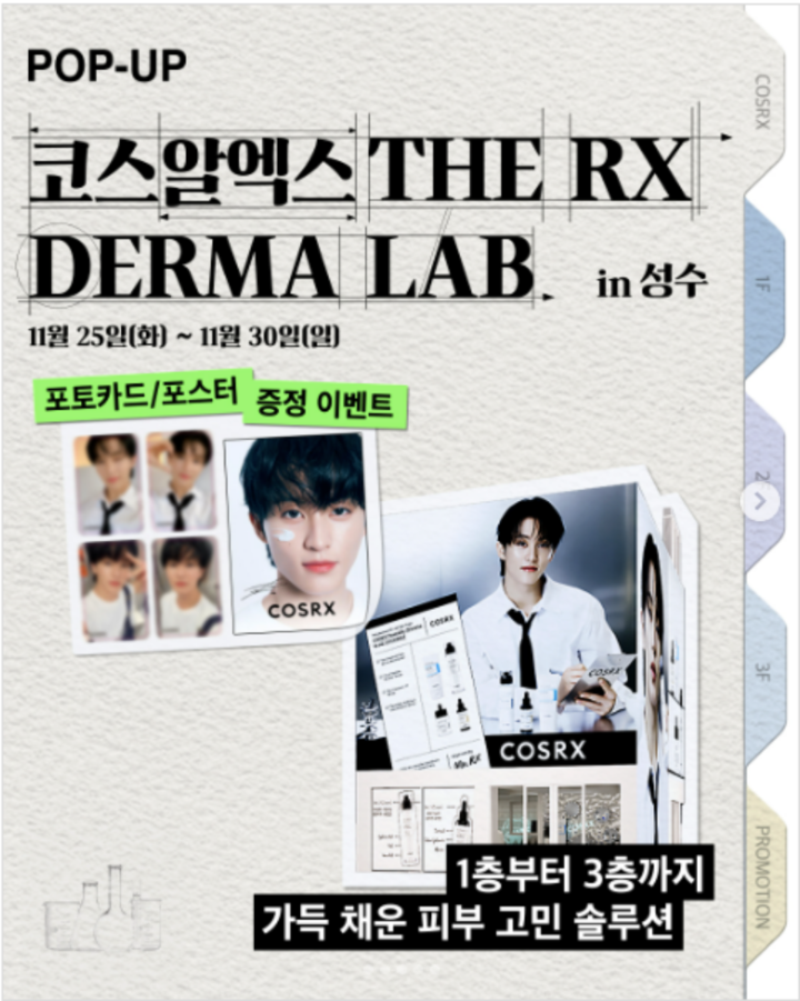 이번 팝업은 '더마 랩' 콘셉트로, 코스알엑스가 수많은 글로벌 피부 테이터와 실제 소비자 리뷰를 기반으로 연구해 온 정교한 더마 솔루션을 소비자들이 직접 경험할 수 있도록 구성됐다. 특히 심층적인 피부 상태 분석을 위한 AI스킨 분석존을 마련하여, 개인별 피부 타입과 고민을 진단하고 맞춤형 처방을 제공하는 것이 특징이다.