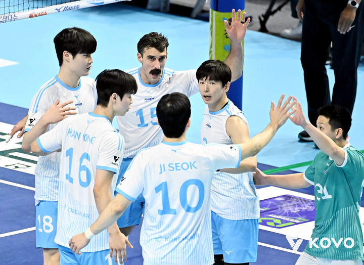 이 승리로 대한항공은 한 경기를 덜 치른 8승1패(승점 22점)로 선두에 올라있다. KB손해보함은 6승4패, 승점 19점으로 2위다.