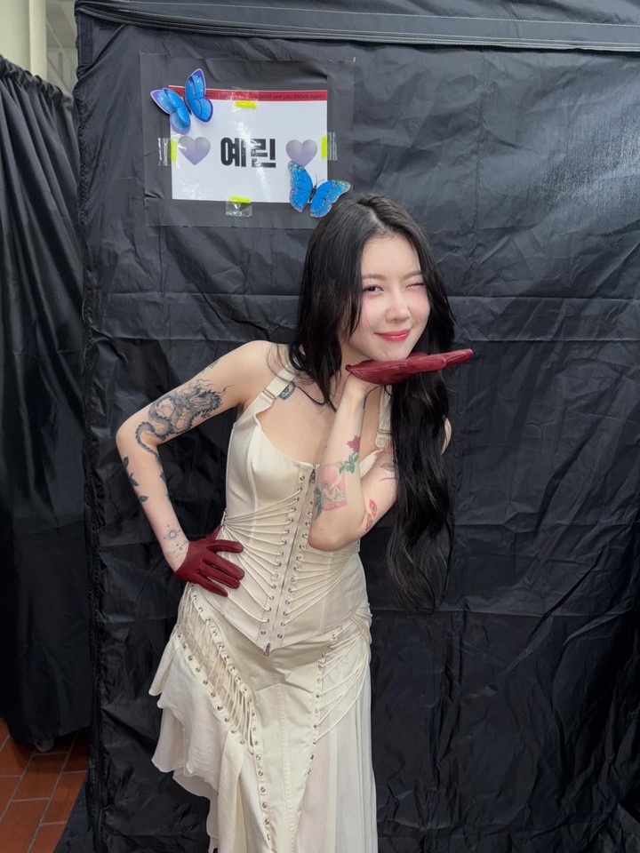 여기에 팔과 다리를 채운 타투와 짙은 버건디 컬러의 가죽 장갑, 무릎 위까지 올라오는 블랙 롱부츠를 매치해, 청순함과 강렬함이 공존하는 백예린만의 몽환 무드를 선보였다.
