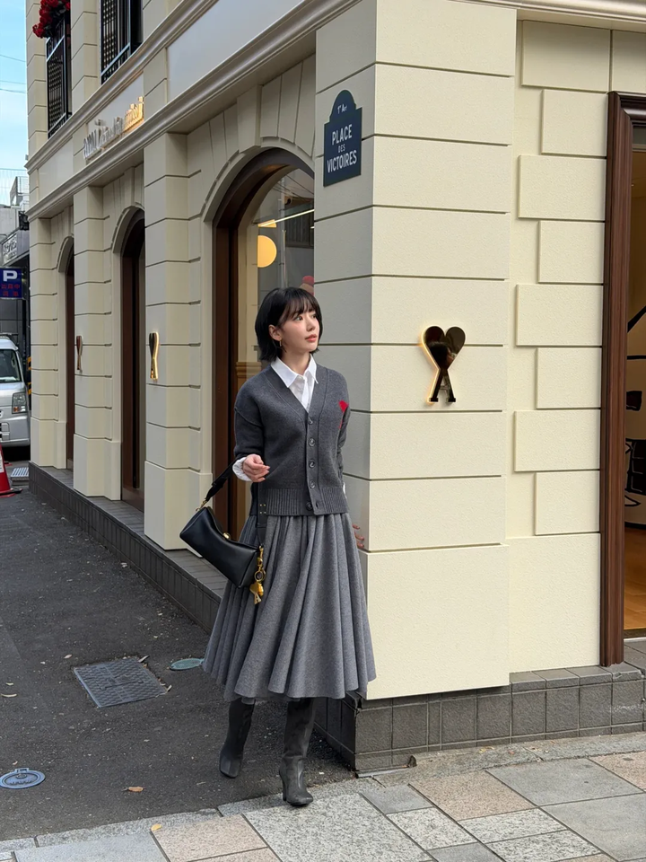 사진 속에서 사쿠라는 짙은 그레이 컬러의 가디건과 화이트 셔츠, 풍성한 주름이 잡힌 플레어 스커트를 매치해 마치 프렌치 스쿨룩을 연상시키는 스타일을 완성했다.