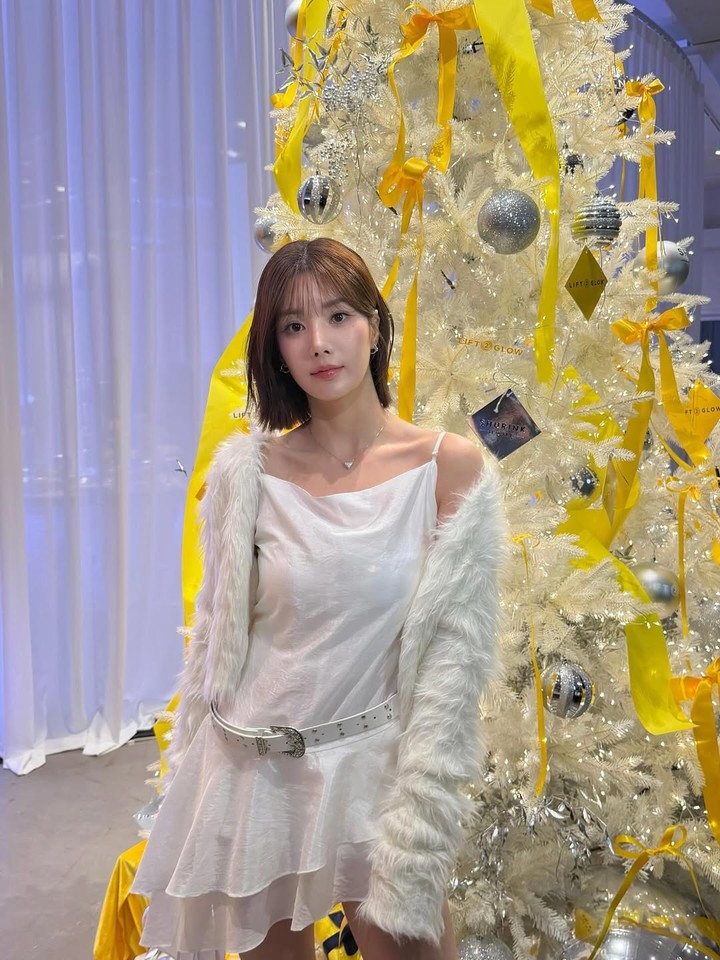 在公开的照片中,权恩妃身穿白色吊带裙,搭配毛绒外套,演绎出精致优雅的冬季穿搭。她站在圣诞树前,烘托出温馨浪漫的氛围,尽显可爱与迷人的双重魅力。造型中的白色高跟鞋与腰带成为点睛之笔,为整体风格增添了华丽且女性化的氛围。