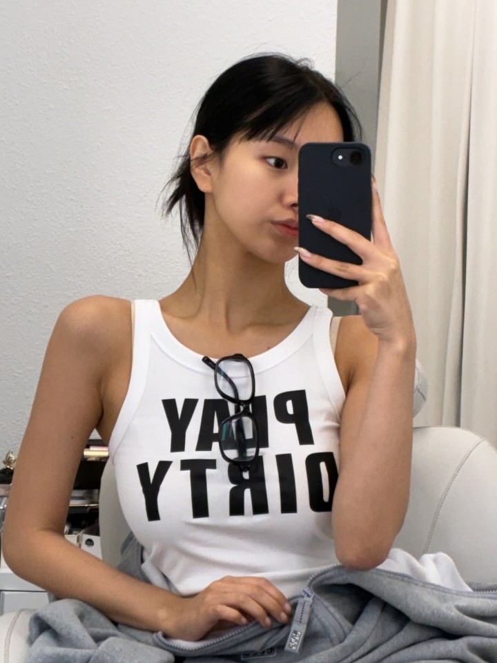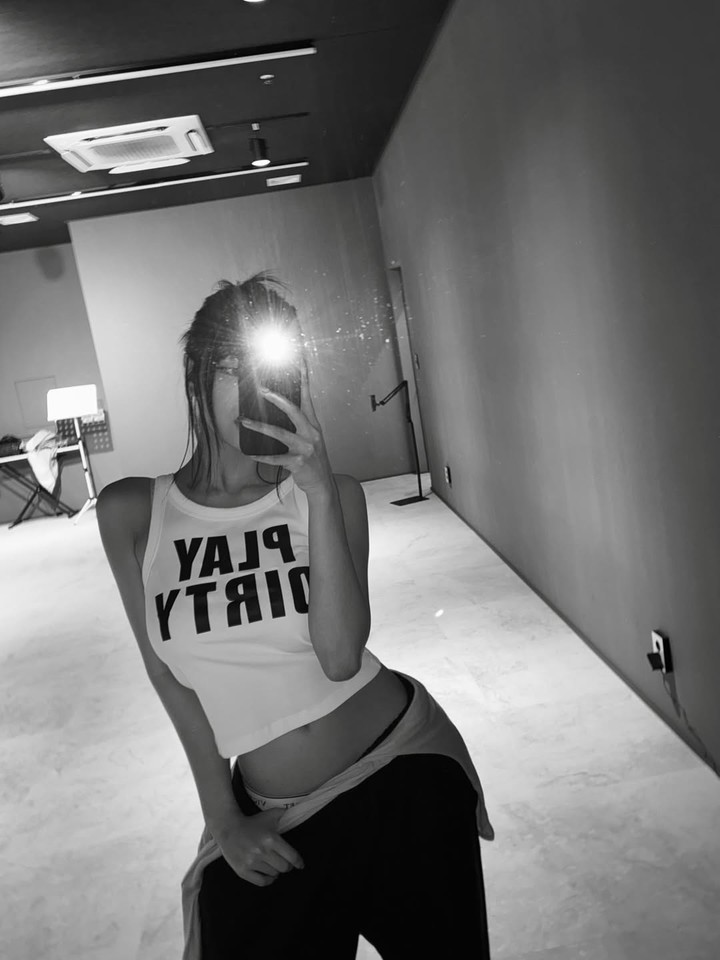 화이트 크롭탑과 트레이닝 팬츠로 연습실 셀카 공개
