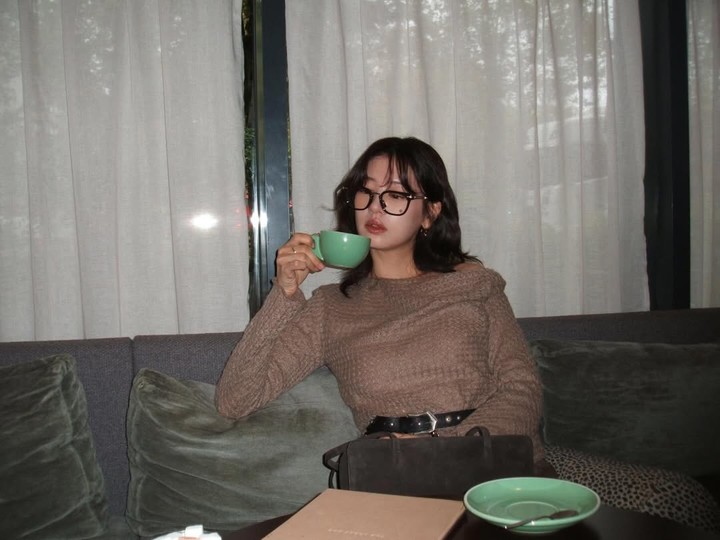 이어 안경을 쓰고 따뜻한 커피를 들고 있는 컷에서는 지적인 무드가 확 살아났다. 과하지 않은 블러셔와 또렷한 아이라인이 얼굴의 입체감을 살리며, 무심한 표정까지도 화보처럼 보인다.