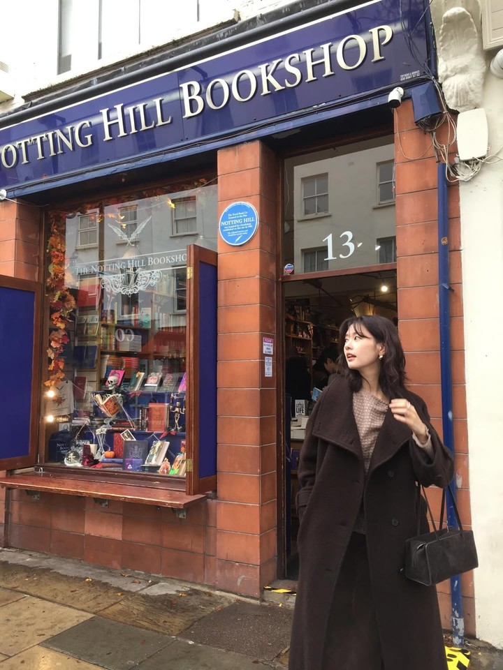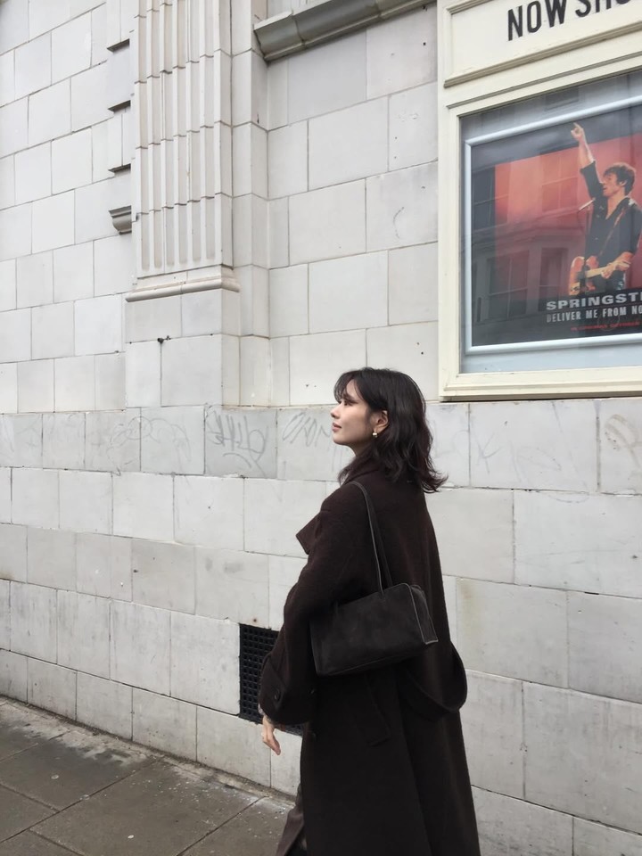 서점 앞에서 찍은 야외 사진은 여행 감성을 제대로 터뜨렸다. 다크 브라운 코트를 툭 걸친 채 고개를 들어 올린 순간, 거리의 가을 풍경과 함께 영화 속 한 장면 같은 서사가 완성됐다.